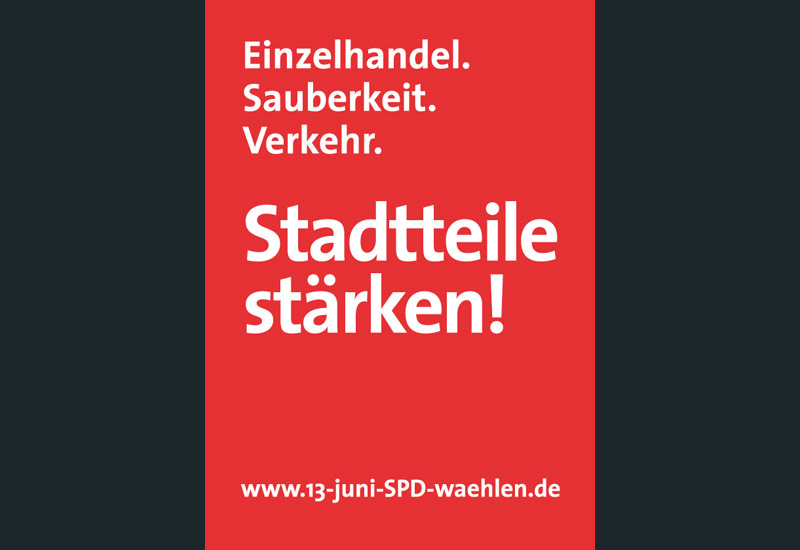 Im Sommer 2004 befindet sich die Bundes-SPD in einem Tief, das auf die Mannheimer SPD abzustrahlen droht. Mittelpunkt unserer Kommunikation für die Kommunalwahl 2004 daher: die Kandidaten. Ohne dabei die Partei zu vernachlässigen: ihre Farben bilden den Hintergrund aller Porträts, das Quadrat das Raster, mit dem sich die Maßnahmen in einheitlichem Look realisieren lassen. Der Abwärtstrend wird gestoppt, die Lücke zur CDU so gut wie geschlossen.